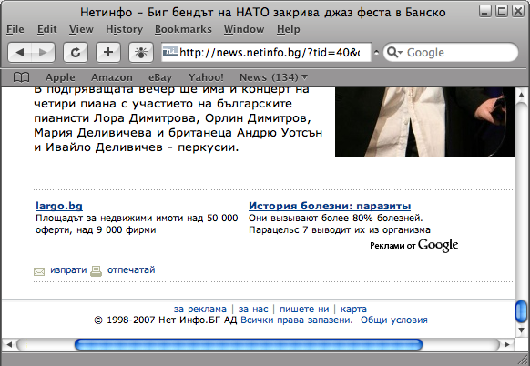 Ðовина на Netinfo.bg за джаз-феÑтивала в БанÑко – тук даже и на режим „фантазиѓне мога да Ð½Ð°Ð¿Ñ€Ð°Ð²Ñ Ð²Ñ€ÑŠÐ·ÐºÐ° между Ñъдържанието на Ñтраницата и предложениете реклами. Това което прави впечетление, е че отново имаме реклама от тип „тухли“ (да Ñе чете „недвижимо имущеÑтво“), и имаме реклама коÑто не е на българÑки, а е на руÑки. Сега, ще Ñе ÑъглаÑÑ Ñ Ñ‚Ð°ÐºÐ¾Ð²Ð° нещо за Ñайт като Ð¼Ð¾Ñ Ð±Ð»Ð¾Ð³, на който има мешено българÑки по поÑтовете и английÑки по „Ñлужебните“линкове, и на Google Adsense му е трудно да вдене на какъв език да прати реклами, и праща и на английÑки, и на българÑки (Ñ Ð¿Ñ€ÐµÐ²ÐµÑ Ð½Ð° английÑките разбира Ñе, но за това по-къÑно). Как ще Ñе обеÑни обаче пращането на руÑки реклами ? Един от вариантите по който мога да Ñпекулирам е content-type charset-а, който е деглариран в заглавната чаÑÑ‚ на Ñтраницата: